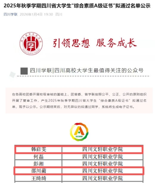 近日,四川省大学生“综合素质A级证书”2025年秋季学期拟通过名单正式公示。我院学子在此次评选中表现突出,2024级空中乘务技术1班韩启雯、2024级计算机网络技术3班邵川蔺两位同学凭借其全面发展的优异表现,成功获评该项省级重要荣誉。