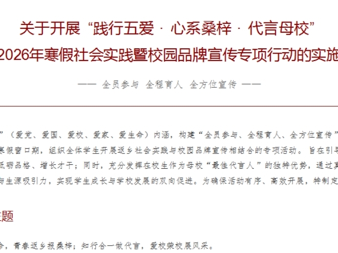 寒假期间,学院面向全体学生部署“践行五爱 心系桑梓 代言母校”社会实践活动,引导同学们在假期中立足家乡、扎根实践,以实际行动践行爱党、爱国、爱校、爱家、爱生命的“五爱”精神,心系家乡发展,主动宣传母校,展现信息学院学子的良好精神风貌。各辅导员积极做好宣传动员与指导工作,鼓励学生结合专业特长与家乡实际,开展形式多样的实践活动。