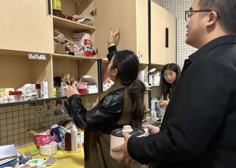 同时还进行卫生环境检查,针对部分地面有杂物、物品堆放杂乱、窗户未及时开启通风等不达标的寝室,通过当场指出问题,结合校园寝室管理规范给出整理建议,帮助学生树立良好生活意识,在筑牢安全防线的基础上,共同营造安全、整洁、舒适的寝室住宿环境。