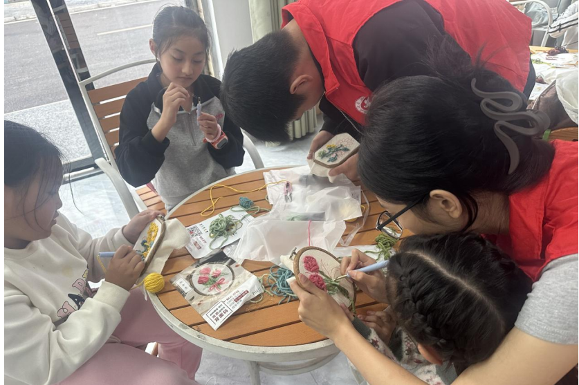 作业辅导结束后,开展手工刺绣实践环节。活动先由专业老师讲解刺绣的类型、历史背景及基础工具用法,帮助孩子们初步了解这项传统技艺。随后,由志愿者组织孩子们进行刺绣实践,全程陪伴引导,帮助孩子们亲身体验传统刺绣的魅力,同时也为周末时光增添了别样手工体验。